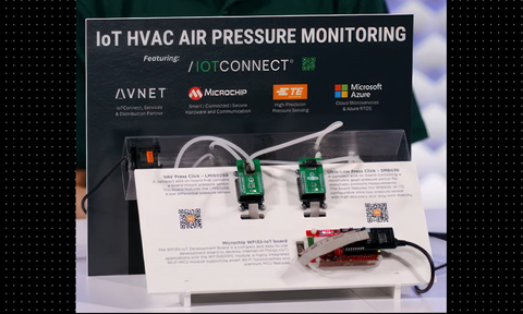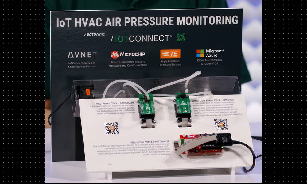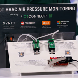 Visitors to these booths can dive deeper into the demos at the show. For example, the connected HVAC demonstrator combines pressure sensors from TE Connectivity with a Wi-Fi-enabled microcontroller development board from Microchip. Information from the sensors is collected by the microcontroller and processed using IoTConnect software. The processed data is then passed to another IoTConnect component running on the cloud platform. A web-based dashboard, also generated using IoTConnect technology, allows the sensor data to be monitored and actions to be sent back to the board.